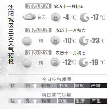 预计周三,沈城最高气温将跌至-4℃左右;本周最冷时段将锁定周四和周五,白天最高气温仅徘徊在-10℃到-12℃之间,尤其周四清晨最低气温更是会探底-23℃附近,酷寒威力堪比“三九”天。目前来看,预计周六暖气团将抵达,沈城气温稳步上扬,寒意逐渐消退,体感舒适度有所改善,周日气温继续回升。(沈阳晚报、沈阳发布客户端记者徐佳婷)