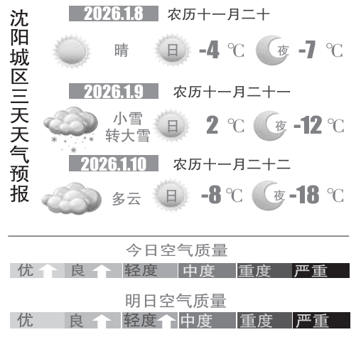 预计周四沈城天空放晴,最高气温小幅回升,南风3~4级,体感比前一天舒适不少,这份冬日里的晴好时光格外珍贵,建议大家好好把握,毕竟“三九天”已经蓄势待发。目前来看,周五(9日)白天以多云天气为主,最高气温飙升到2℃附近;傍晚至夜间,沈阳地区将迎来一次明显的降雪过程,主要降雪时段在周五夜间。降雪过后,大风降温天气无缝衔接,周六(10日)最高气温骤降至-8℃,气温下降幅度非常大,道路湿滑,大家出行要格外注意交通安全。(沈阳晚报、沈阳发布客户端记者徐佳婷)