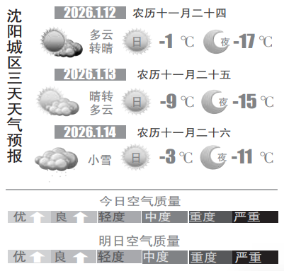 上周日(1月11日)夜间,一股弱冷空气悄悄潜入沈阳。当天,记者从沈阳市气象部门获悉,受弱冷空气影响,预计周一(12日)清晨,沈阳部分地区可能飘落零星的雪花,大家外出要注意交通安全。这股冷空气实力太弱,且匆匆而过,周一白天,沈阳气温大幅回升,最高气温将飙升至-1℃附近,是本周气温最高的一天,中午前后冰雪融化,建议大家外出最好穿深色或者耐脏的裤子和鞋子。