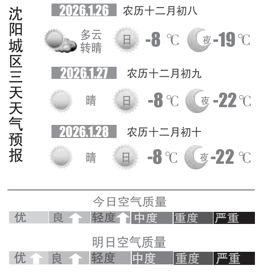 目前来看,天气在短暂的波动之后重新转晴,周二(27日)到周四(29日)晴空万里,气温也再度回落,虽然再也不复前几日的极寒,但最低气温将稳定在-22℃附近,仍然十分寒冷,大家外出选择衣物搭配的时候还是要以保暖为主。周五(30日)开始气温将出现持续的回升,到2月初白天最高气温有望回到-5℃以上,但并不稳定,冷空气或寒潮依然有可能重返,大家还是要关注临近天气预报,做好起居出行的安排。(沈阳晚报、沈阳发布客户端记者徐佳婷)