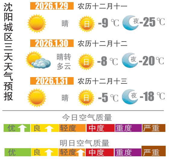 1月28日,记者从沈阳市气象部门获悉,预计周四(29日)沈城晴日依旧相伴,最高气温在-9℃左右,最低气温在-25℃上下,晴冷的天气里阳光是最好的馈赠,大家不妨在午后出门走走,感受冬日独有的静谧与安然;周五(30日)沈城以晴天为主,云朵偶有穿梭,气温稍有回升,不过幅度不大,最高气温在-8℃上下,最低气温在-20℃附近,提醒早晚外出的市民,依然要做好防寒保暖,以免感冒。