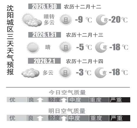 1月29日,记者从沈阳市气象部门获悉,预计周五(30日)白天随着冷空气的撤离,沈城气温终于踏上回升之旅,白天最高气温在-9℃上下,虽然气温回升幅度不大,但是风向转为偏南风,寒冷的体感稍有缓解。