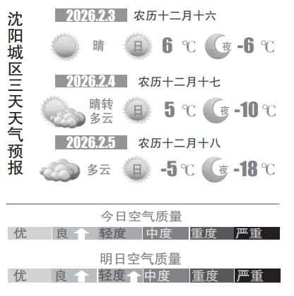 本周沈城天气以晴为主,先暖后冷且气温波动较大。2月2日,记者从市气象部门获悉,预计周二(3日)白天,在强劲的偏南风助推下,沈城最高气温将飙升至6℃。但是,此时的暖空气还不足以把这么高的气温维持住,剧烈的升温往往都伴随着随后更猛烈的降温。