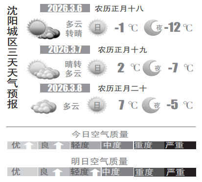 当天,记者从沈阳市气象部门获悉,根据最新的气象资料分析,预计周五至下周日,沈城晴云相伴,气温缓步回升,最高气温在-1℃到7℃之间,最低气温在-5℃到-12℃之间。需要提醒的是,此季节昼夜温差较大,风力时有变化,大家外出要注意防风和保暖;同时,晴好天气适宜开窗通风,适度开展户外活动,增强身体免疫力。(沈阳晚报、沈阳发布客户端记者徐佳婷)