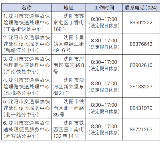 目前,沈阳四环内均匀布设6处快处快赔中心,完全不受事故发生区域限制,当事人先安全撤离现场、避免占道,之后可就近任选一家办理。