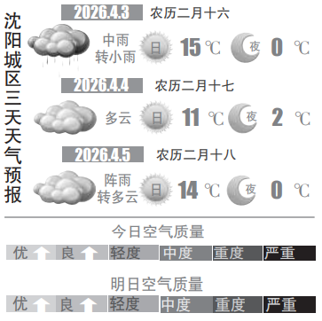 4月2日,记者从沈阳市气象部门获悉,受高空槽和冷空气的共同影响,周五(3日)风雨结伴而至,沈阳将迎来今年首场透雨。白天以中雨为主,局部大雨,南风5~6级,阵风可达7~9级,最高气温在15℃左右;夜间将出现雨夹雪天气,最低气温在0℃附近,风力依旧强劲;城区主要降水时段为16点至22点。这场风雨将为出行带来不利影响,提醒大家外出要携带好雨具,司机出行请减速慢行,保持安全车距。