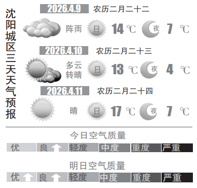 4月8日,记者从沈阳市气象部门获悉,预计周四(9日)沈城以多云天气为主,中午到夜间有阵雨,雨量不大,却是淅淅沥沥、断断续续,细雨轻落,微风携凉,最高气温滑落至14℃附近,最低气温仍维持在7℃上下,昼夜温差趋于温和,大家不必再反复添减衣物。