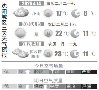 当天,记者从沈阳市气象部门获悉,周二(14日)沈城将迎来一场名副其实的春雨,预计下午到夜间,沈阳地区有小雨,局部中雨,平均降水量3~8毫米,部分地方雨量会更大一些,并伴有弱雷电。城区主要降水时段为14日16时至20时。常言道“春雨贵如油”,这场雨可以净化空气,降低森林火险等级,提醒大家外出携带雨具,雨天路面湿滑,出行务必注意安全。