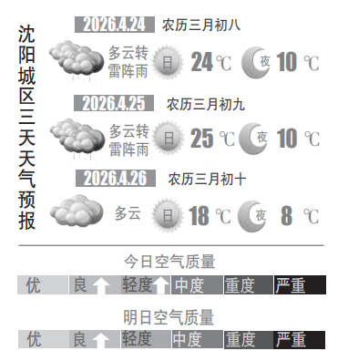 预计,周六(25日)白天以多云为主,风力同样较大,最高气温达到25℃;夜间有一次较为明显的降雨过程,其中南部地区雨量偏大,局地可能达到中雨量级,同样可能伴有强对流天气。雨后气温明显回落,周日(26日)到下周二(28日)受偏北风影响,沈城气温持续偏低,白天最高气温保持在20℃以下,夜间最低气温不足10℃,风力较大的日子里会显得有些寒凉,大家要关注临近的天气预报,适时添衣保暖。(沈阳晚报、沈阳发布客户端记者徐佳婷)