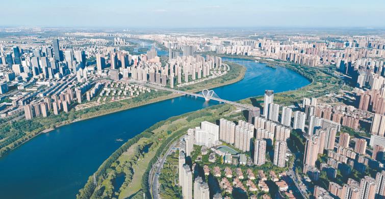 浑河水道蜿蜒盘旋,与楼宇、绿树、蓝天构成了一幅美丽的生态画卷。近年来,沈阳市有效推进河长制工作,按照“河畅、水清、岸绿、景美”的要求,通过水质改善、生态修复,使浑河流域尽显生态之美。(李浩摄)