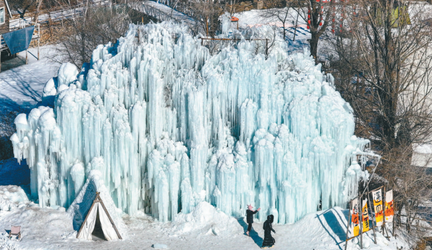 沈阳冬日限定美景冰瀑在东陵郊野公园亮相,将静谧与壮美展现得淋漓尽致。1月27日,游客在此打卡拍照。(张文魁摄
