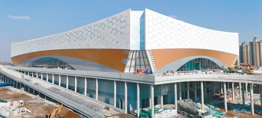 4月7日,沈阳王家湾冰上运动中心外立面工程完工,屋面、照明、机电安装等系列作业正同步推进。(李浩摄